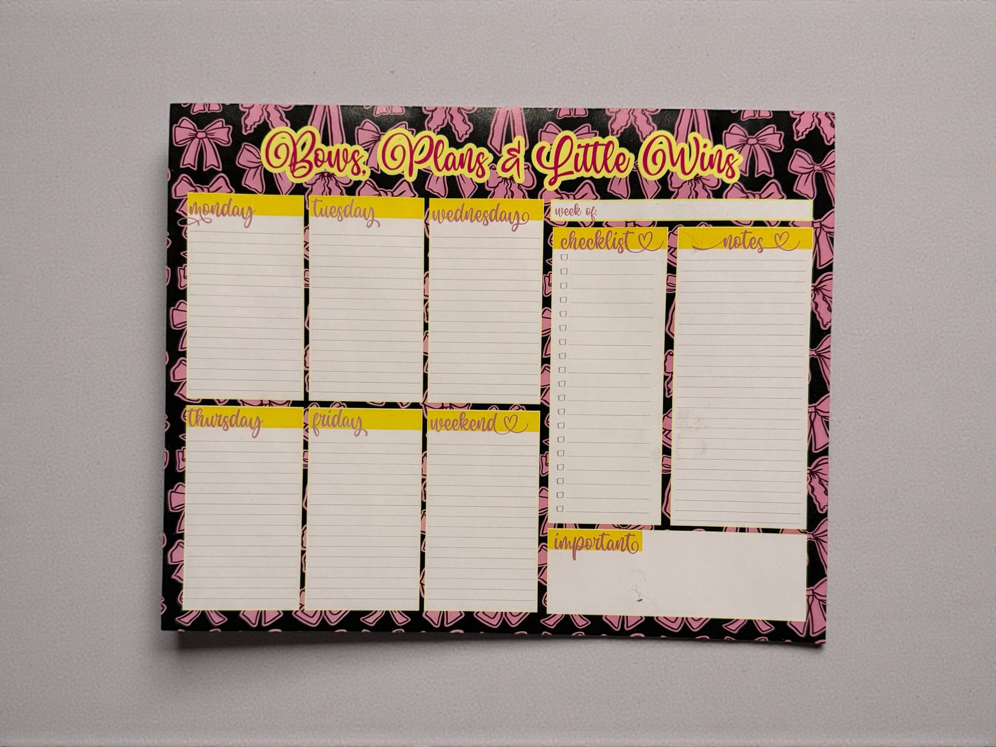 Plan your week with a little sparkle and a whole lot of style. This 8.5" x 11" weekly notepad is wrapped in a bold pink-and-black bow pattern and packed with organized spaces to help you stay on track while celebrating the small victories along the way.