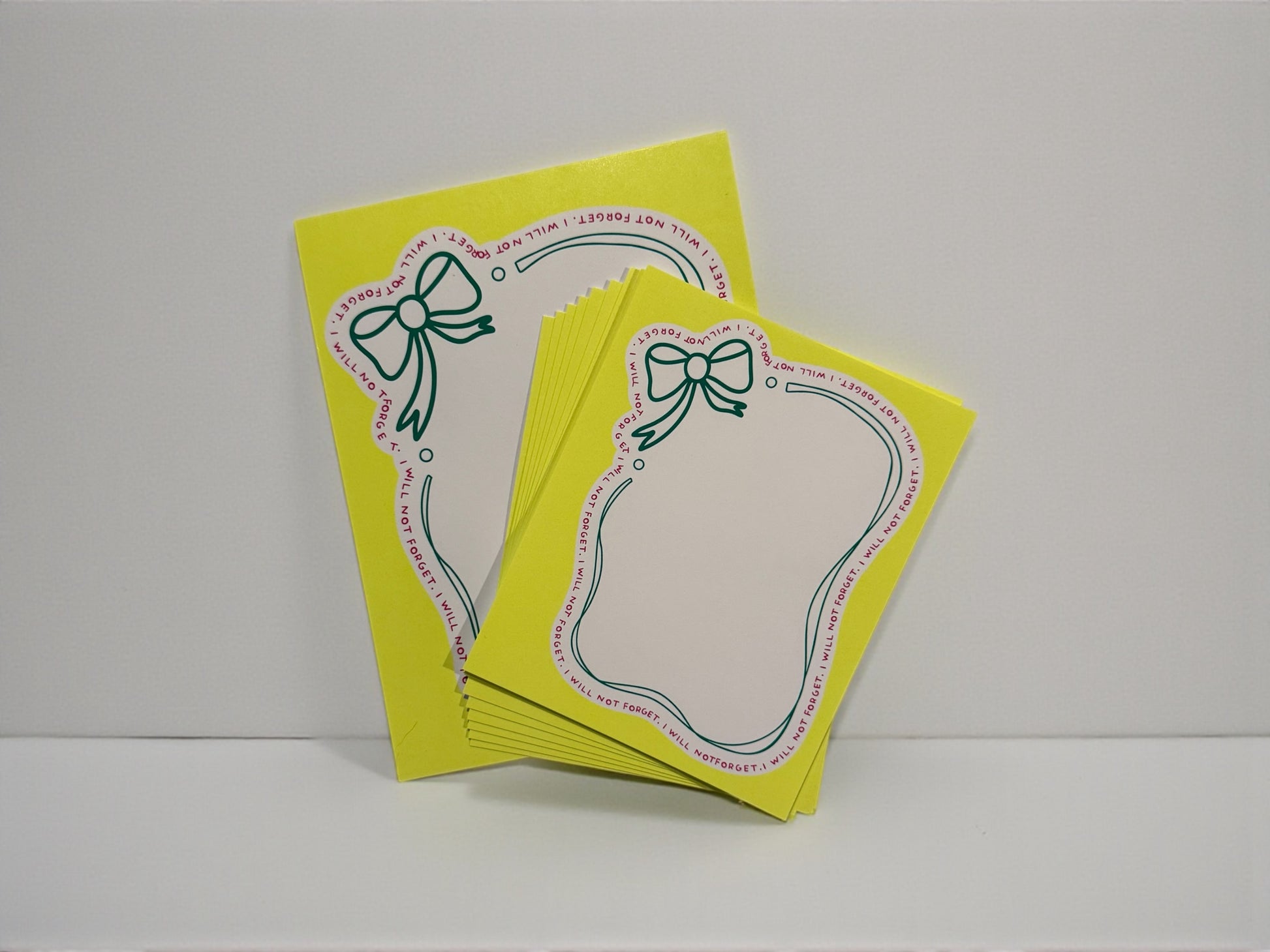 A cheerful (and slightly dramatic) reminder to keep your tasks and thoughts front and center. This neon-bordered stationery set features a playful hand-drawn frame, a sweet bow illustration, and the repeating phrase “I will not forget”—perfect for notes, reminders, and messages you really don’t want slipping through the cracks.
