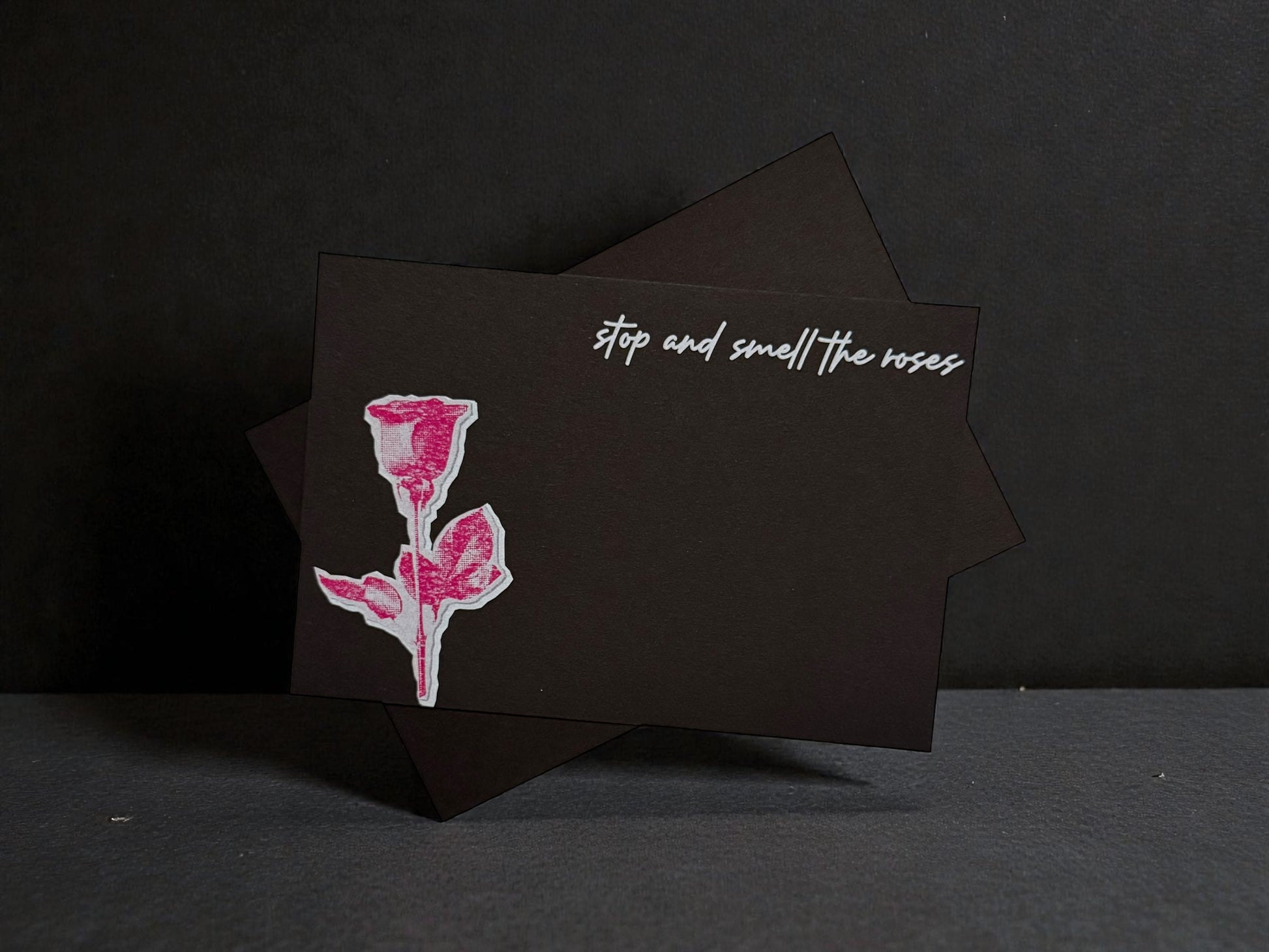 A little reminder wrapped in a whole lot of attitude. These elegant black notecards feature specialty white toner lettering paired with a vivid pink rose illustration that pops beautifully against the dark cardstock. They’re equal parts soft and edgy—perfect for thoughtful notes with a twist.